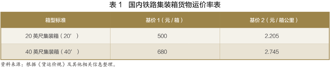 根據(jù)《中華人民共和國鐵道部鐵路貨物運(yùn)價(jià)規(guī)則(鐵運(yùn)[2005]46號(hào))》(以下簡稱“貨運(yùn)價(jià)規(guī)”)以及國家發(fā)展改革委發(fā)布的關(guān)于調(diào)整鐵路貨物運(yùn)價(jià)價(jià)格的相關(guān)通知文件(《國家發(fā)展改革委關(guān)于調(diào)整鐵路貨運(yùn)價(jià)格進(jìn)一步完善價(jià)格形成機(jī)制的通知》發(fā)改價(jià)格〔2015〕183號(hào)),國際鐵路聯(lián)運(yùn)的國內(nèi)段集裝箱貨物運(yùn)輸?shù)摹盎鶅r(jià)1”(也稱發(fā)到基價(jià))為500元/TEU(20英尺箱)和680元/FEU(40英尺箱),“基價(jià)2”(也稱運(yùn)行基價(jià))為2.205元/TEU*公里和2.754元/FEU*公里(見表1)。集裝箱貨物每箱運(yùn)費(fèi)的計(jì)算方法為基價(jià)1+基價(jià)2×運(yùn)價(jià)公里。此外,按照鐵路相關(guān)規(guī)定,國際鐵路聯(lián)運(yùn)的國內(nèi)段運(yùn)輸,還需要繳納電氣化附加費(fèi)、新路新價(jià)均攤費(fèi)、鐵路建設(shè)基金等費(fèi)用,由于項(xiàng)目較多且近年來有所調(diào)整,在此不再贅述。值得一提的是,2016年11月,國家發(fā)展改革委發(fā)布《關(guān)于清理規(guī)范涉及鐵路貨物運(yùn)輸有關(guān)收費(fèi)的通知》(發(fā)改價(jià)格〔2016〕2498號(hào)),要求相關(guān)收費(fèi)主體限期清理規(guī)范鐵路貨物運(yùn)輸過程中除鐵路運(yùn)價(jià)之外的各種收費(fèi),其中涉及鐵路運(yùn)輸企業(yè)的收費(fèi)包括鐵路貨物運(yùn)輸雜費(fèi)、向?qū)S镁產(chǎn)權(quán)或經(jīng)營單位收取的專用線代維修代維護(hù)等費(fèi)用。