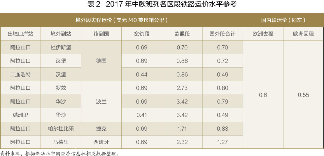 根據(jù)2017年各班列運(yùn)行線路公布的運(yùn)價(jià)水平,寬軌段的去程平均運(yùn)價(jià)水平大多為0.69美元/大箱公里,經(jīng)二連浩特和滿洲里出境利用西伯利亞大陸橋的運(yùn)價(jià)較低,約為0.4美元/大箱公里;歐盟段的去程平均運(yùn)價(jià)水平差異較大,根據(jù)不同線路走向,從0.7美元/大箱公里至3.42美元/大箱公里不等,高運(yùn)價(jià)率的區(qū)段一般是由于運(yùn)輸里程較短,固定費(fèi)用分?jǐn)傒^多所致。國內(nèi)段的去程平均運(yùn)價(jià)水平約在0.6美元/大箱公里,回程平均運(yùn)價(jià)水平約在0.55美元/大箱公里(見表2)。
